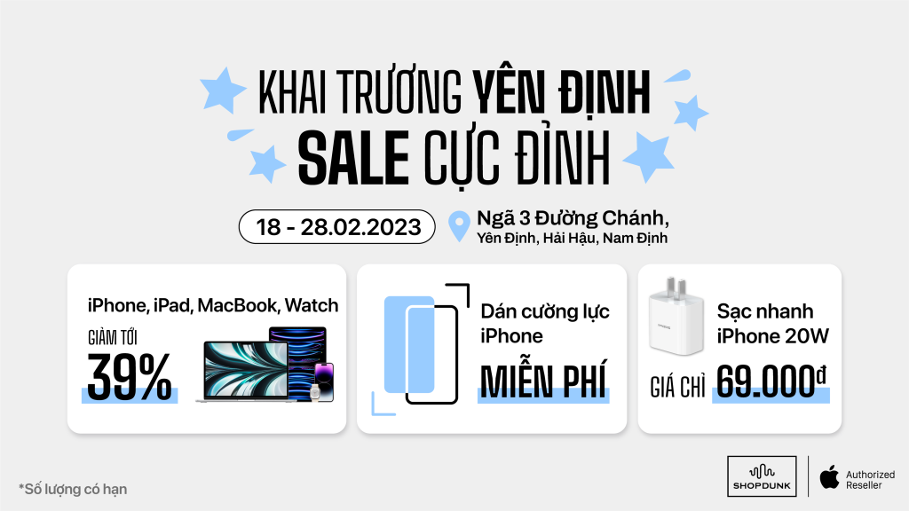 Các thiết bị Apple giảm sâu nhất từ khi ra mắt, chỉ có tại điểm Khai trương ShopDunk Yên Định. Số lượng có hạn, bạn không mua là lỡ!
